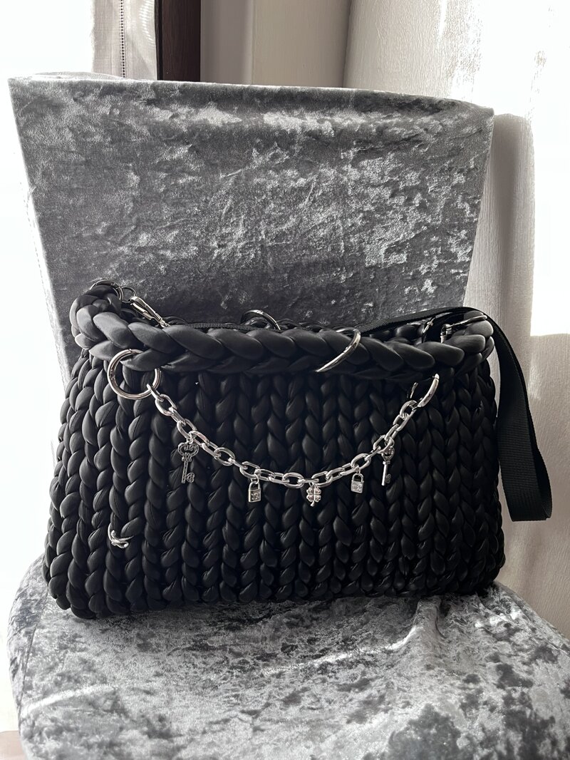 fatta con filato piu piccolo in simil pelle tracolla in tessuto nera 2 moschettoni come chiusura gaget catena con ciondoli